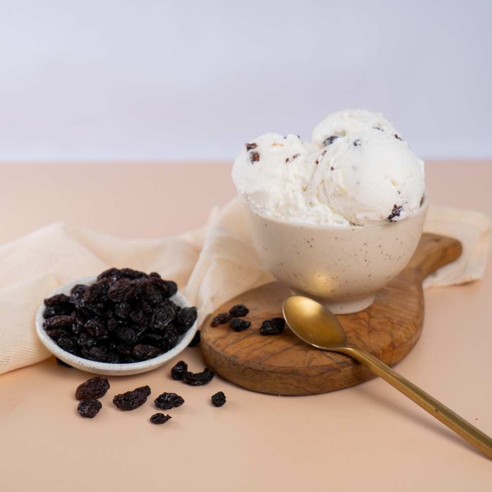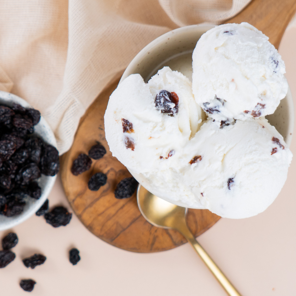 Helado [agua, azúcar, grasa vegetal no hidrogenada, leche en polvo descremada, suero de leche en polvo, emulsificante y estabilizante (mezcla de monoglicéridos y diglicéridos de ácidos grasos, goma guar, goma xantan, carboximetil celulosa sódica), sabor artificial (vainilla)], Uvas pasas. CONTIENE LECHE.