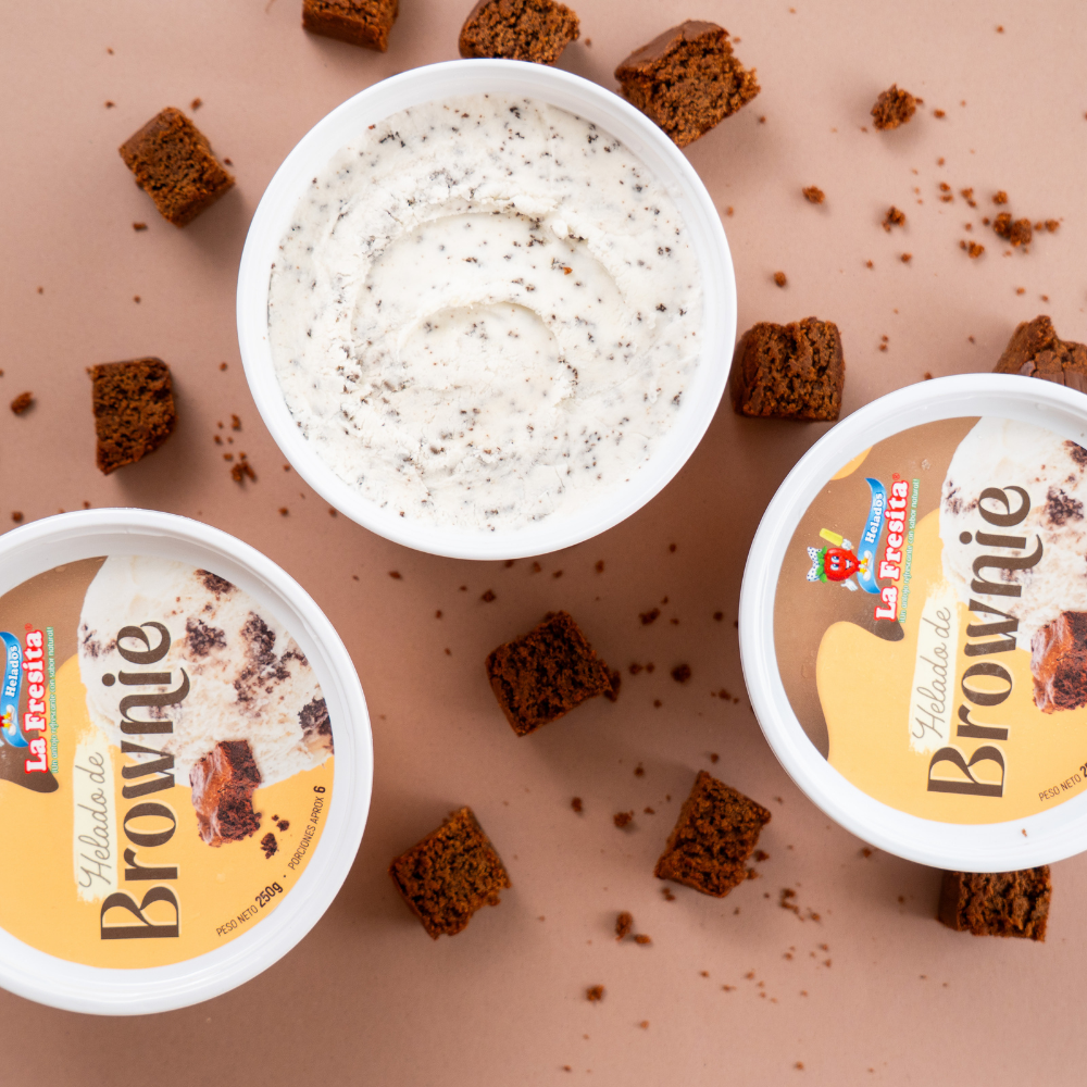 Helado de vainilla con trozos de brownie.