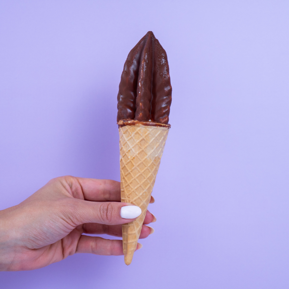 Crujiente cono con helado de vainilla y cobertura de chocolate, 60g.